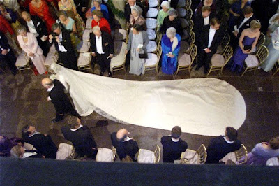 Princess Alexandra is the daughter of Princess Benedikte of Denmark and Prince Richard of Sayn-Wittgenstein-Berleburg (which was once a county in Germany, and is still a Princely house of which Richard is the head). This makes Alexandra the niece of both the Queen of Denmark and the Queen of Greece, and explains why the couple were married in truly royal fashion at the Danish royal family's summer home. This wedding is of particular interest to us this week because Alexandra's sister Nathalie marries on Saturday. Today's topic is the gown, and we'll chat about the rest of the wedding on Friday.