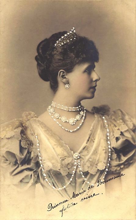 The wedding of Princess Marie of Edinburgh (1875-1938) and Crown Prince Ferdinand of Romania in 1893 was a typically grand occasion, just as one would expect when the bride is the daughter of Prince Alfred, Duke of Edinburgh, and Grand Duchess Maria Alexandrovna of Russia (and therefore a granddaughter of both Queen Victoria and Tsar Alexander II) and the groom is a future king. And just as one would expect from a wedding like this, plenty of precious jewels were among the gifts lavished on the bride. From her father came a parure of turquoise and diamonds, including this tiara of scrolling diamonds surrounding round turquoise stones, plus a necklace and earrings. The set was made by London jeweler Carrington. Other British relatives provided more turquoise jewels in the form of a bracelet and a brooch (