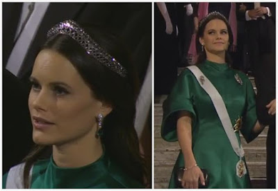The King hosts a palace dinner for the Nobel laureates in Sweden, and it's a second tiara event for the royal ladies. (Check out pictures here.) While Queen Silvia wore red and her other go-to Nobel tiara, the Nine Prong Tiara, we had more tiara interest from the princesses:![]() |