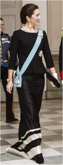 Making sure we don't drown in repeated gowns, Marie's here to save the day in a new number with a printed peplum top and a solid skirt with a train. The way she's pinned on her collar is just lovely, but I'm missing the small portrait brooch of Queen Margrethe (as worn by Mary) - we've seen Marie wear the honor previously, but not tonight. A picky request, though, from a completely elegant appearance. She is wearing her regular
