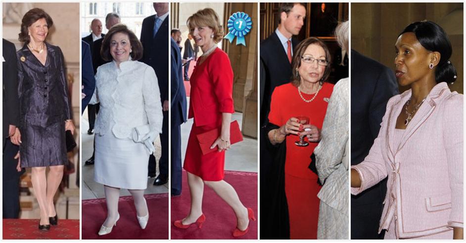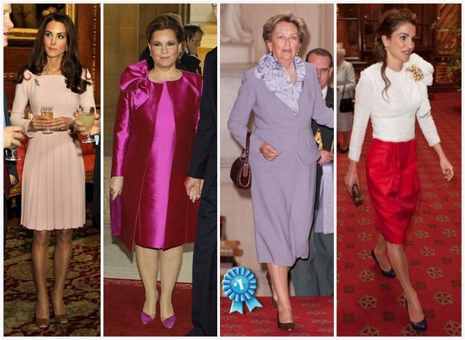 I loved Kate’s demure pink Emilia Wickstead number and was so delighted to see her wearing a brooch (some sort of homage one way or the other to the Broochiest Queen of All perhaps?) that I bumped her up to a special little category. But when it comes to shoulder doodads, she still needs some practice: she kept forgetting her brooch was there and covering it up with the hair. I still prefer that to Maria Teresa’s hubcap shine (repeated from National Day), or the top that Queen Rania stole from an Egyptian mummy on the way up north, but Queen Paola wins this one. She’s lovely, and she’s purple. Done and done.